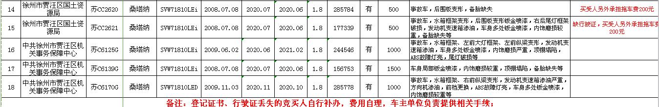 ⑴2008年蘇CC2611桑塔納;⑵2008年蘇CC2612桑塔納;⑶2008年蘇CC2613桑塔納;⑷2008年蘇CC2614桑塔納;⑸2008年蘇CC2615桑塔納;⑹2008年蘇CC2616桑塔納;⑺2008年蘇CC2617桑塔納;⑻2008年蘇CC2618桑塔納;⑼2008年蘇CC2619桑塔納;⑽2008年蘇CC2620桑塔納;⑾2008年蘇C6139G桑塔納;⑿2009年蘇C6170G桑塔納;⒀2009年蘇C6125G桑塔納;⒁2013年蘇C89085長(zhǎng)安之星;⒂2013年蘇C89901長(zhǎng)安之星;⒃2012年蘇C82808帕薩特;⒄2013年蘇CC6162江淮;⒅2007年蘇C5896G帕薩特。