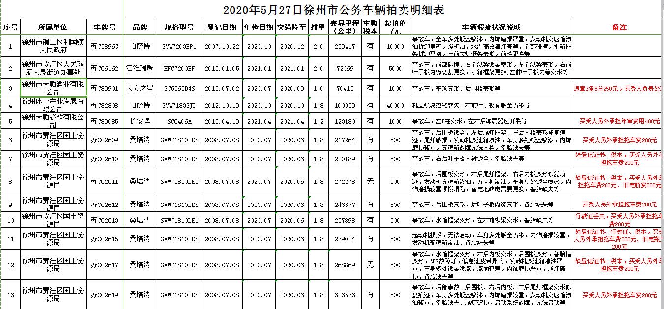 受委托,我公司定于2020年5月27日13:00時(shí)在徐州市銀地二手車(chē)交易市場(chǎng)四樓東南拍賣(mài)大廳通過(guò)現(xiàn)場(chǎng)和汽車(chē)街網(wǎng)絡(luò)拍賣(mài)平臺(tái)同步進(jìn)行的方式公開(kāi)拍賣(mài)以下公務(wù)車(chē)輛: