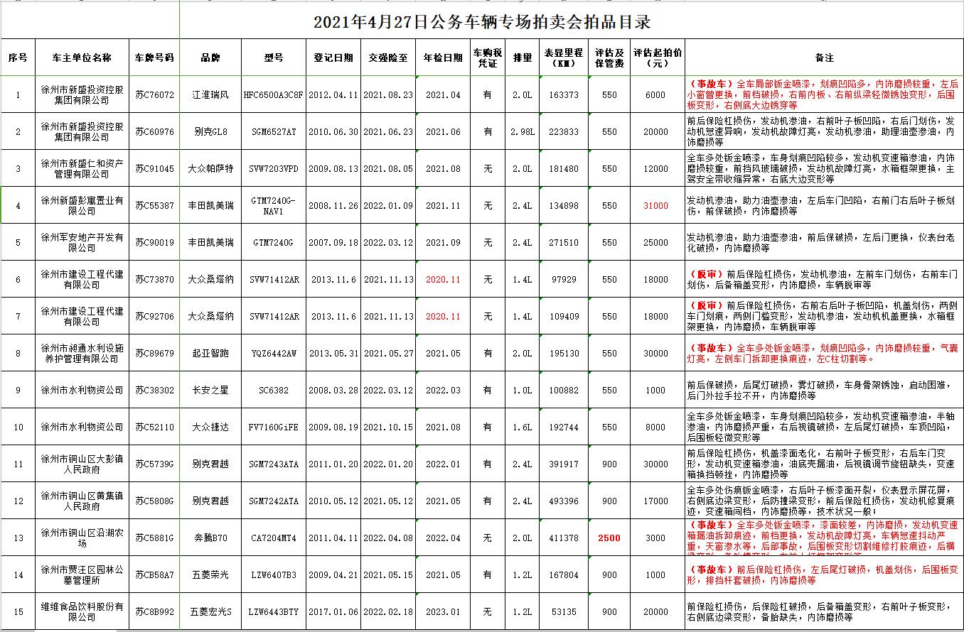 4月22日、23日在徐州中山飯店停車場(chǎng)及徐州銀地二手車交易市場(chǎng)展示。有意競(jìng)買者請(qǐng)持有效證件到我公司辦理報(bào)名手續(xù),并交納每輛車1萬(wàn)元保證金即可參拍,報(bào)名截止至4月26日16時(shí)。