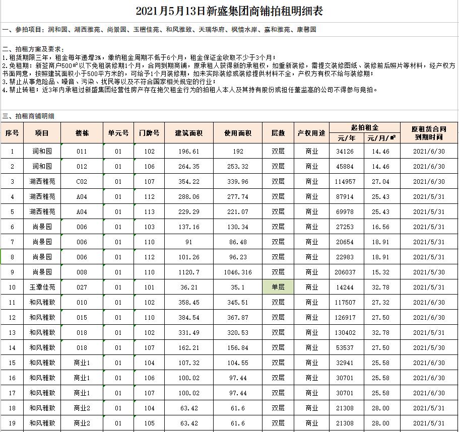 即日起展示。有意者請持有效證件至我公司報名,并交納每間商鋪1萬元保證金即可參拍,報名截止至5月12日16時。