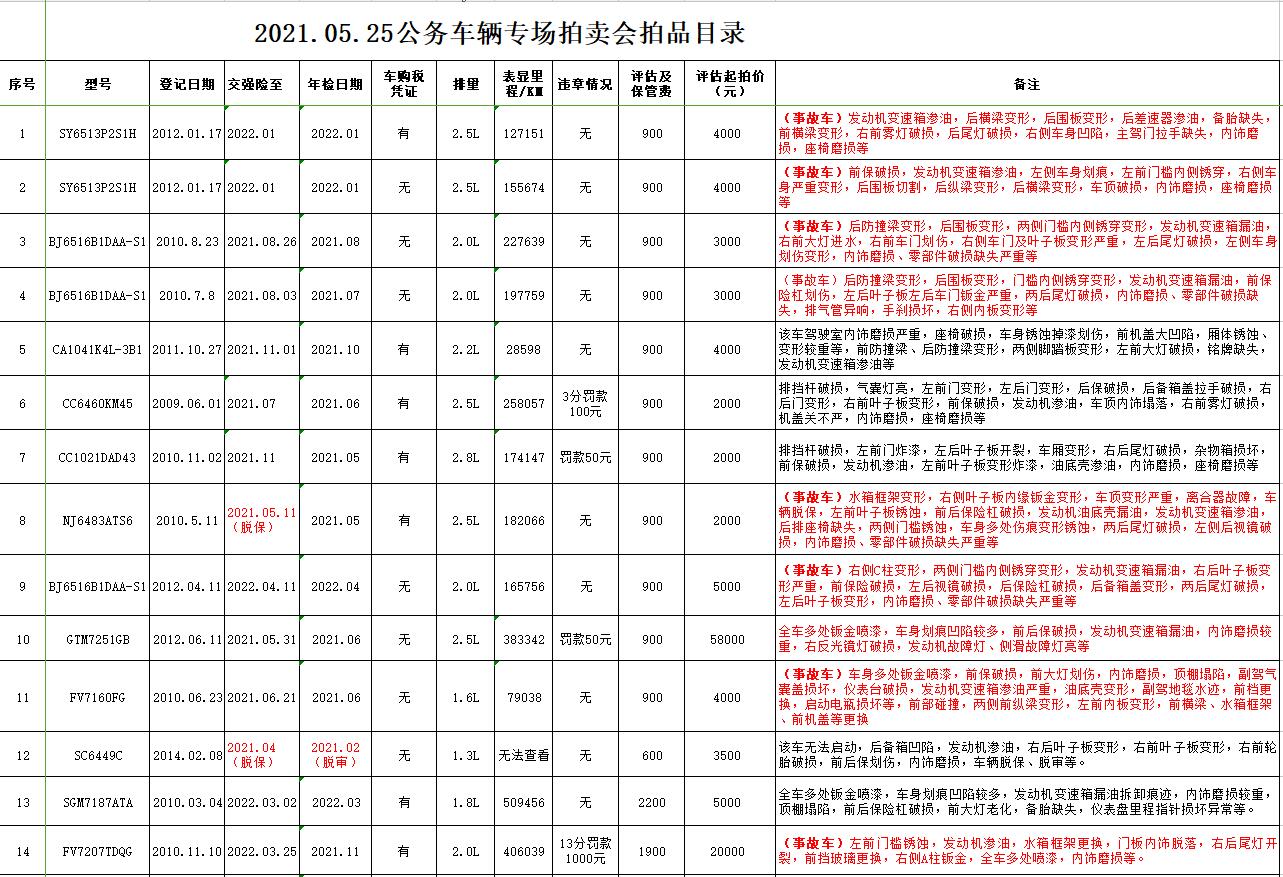 受委托,我公司定于2021年5月25日10時在中拍平臺通過網(wǎng)絡競拍方式公開拍賣以下公務車輛: